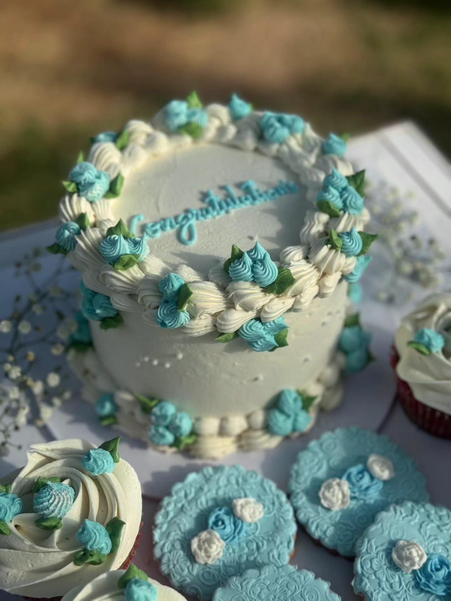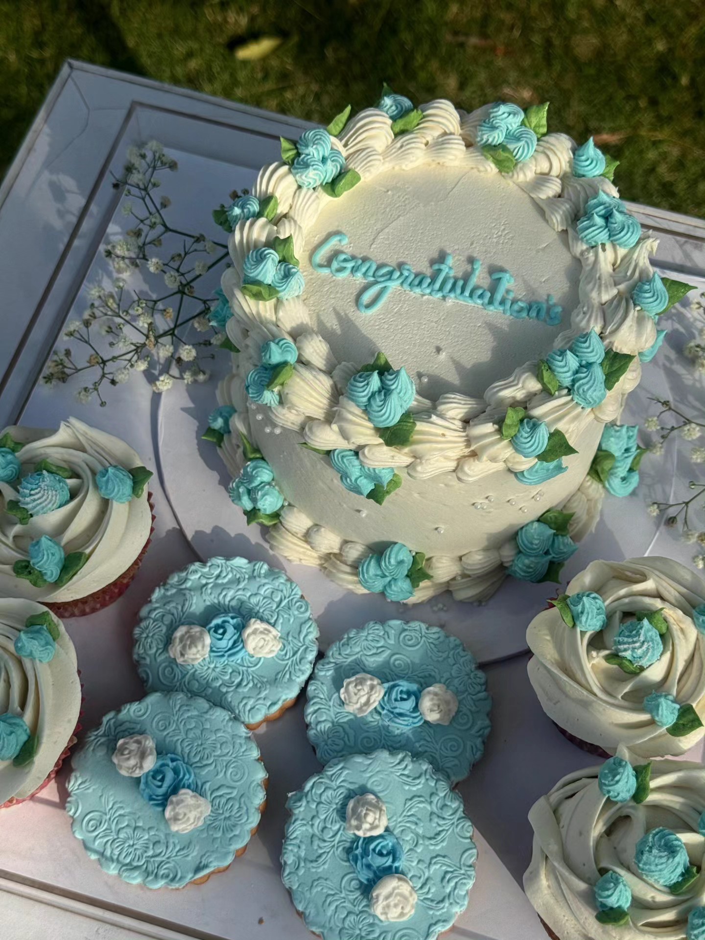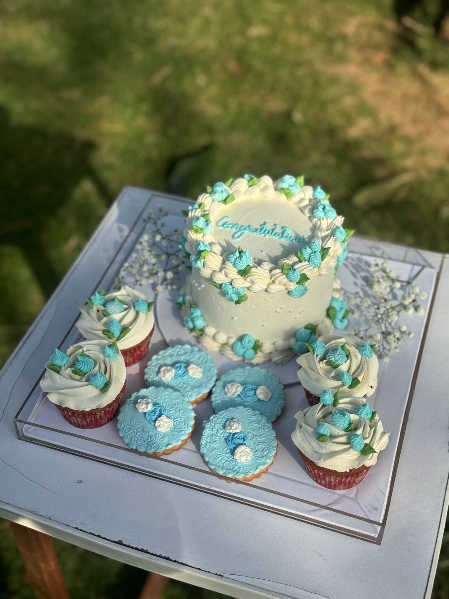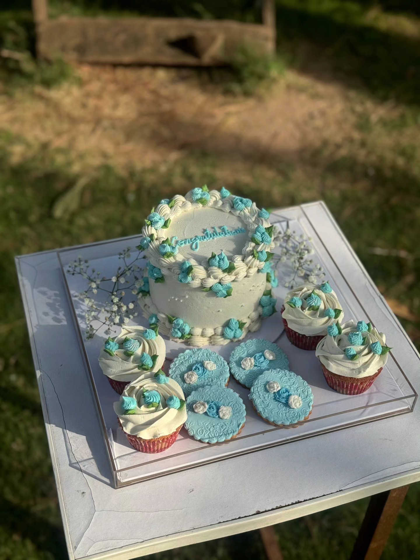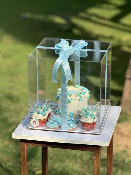 3-pound cake, 4 chocolate cupcakes, 4 cookies in an acrylic box.